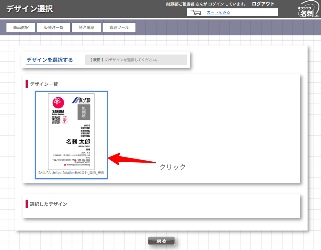 ②「デザイン選択」画面で表面、裏面のデータをそれぞれクリックして決定する。