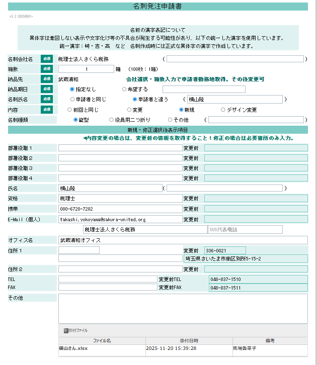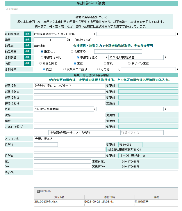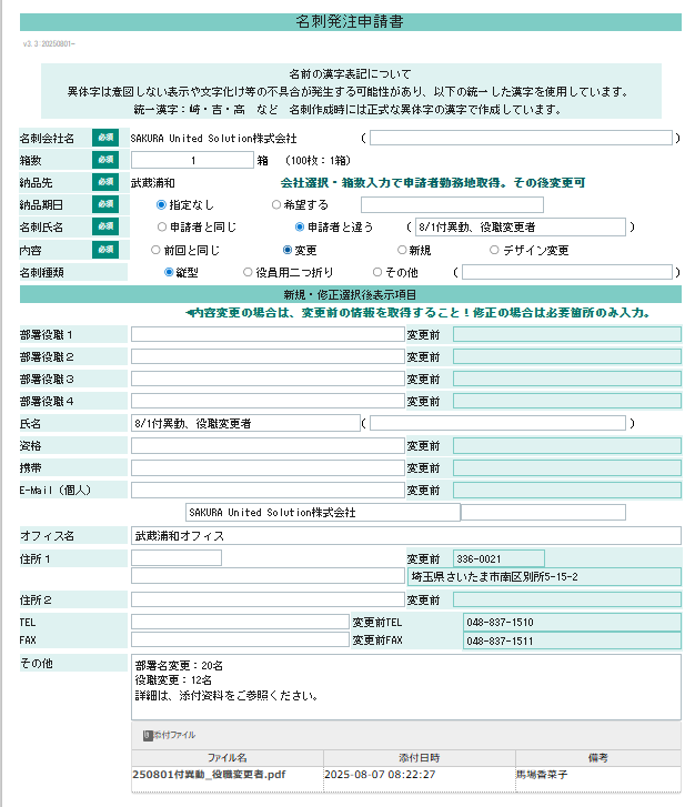 中途入社の方の名刺は各部署MGRから申請が上がってくるので対応する。