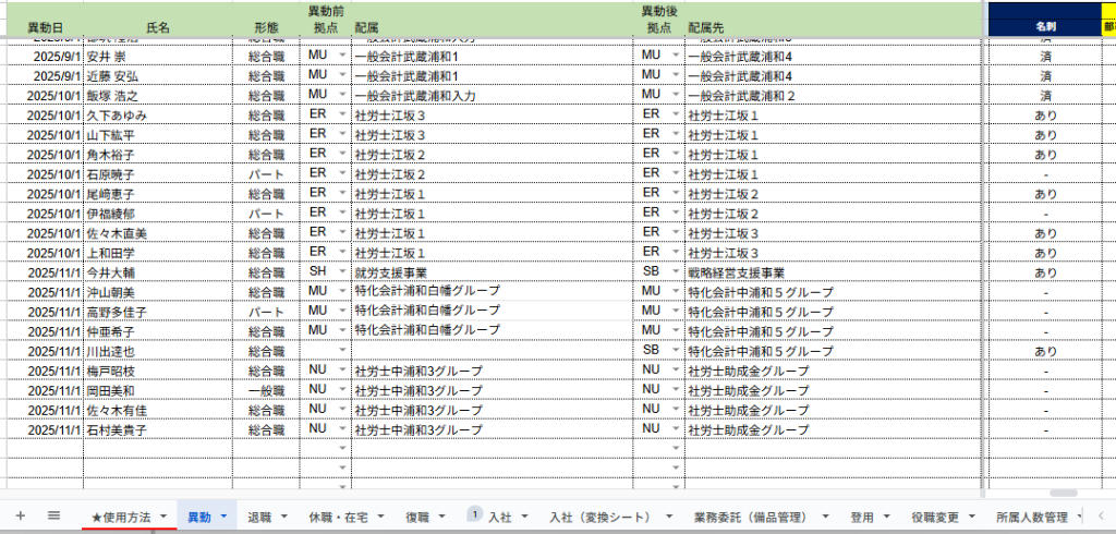 入退社管理表のシート「異動・役職変更・登用」の名刺の項目に変更あり・なしを記入する。