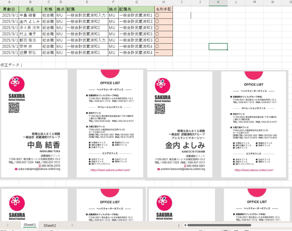 辞令の出た人の中で、名刺を持っている方のみ情報の修正を行う。