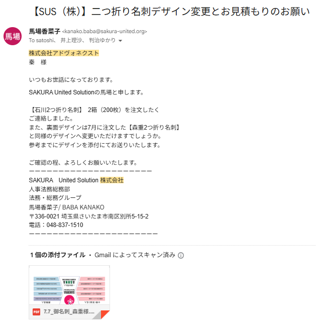 8/1付辞令の新名刺を手配しました。(現在名刺をお持ちの該当者のみ)