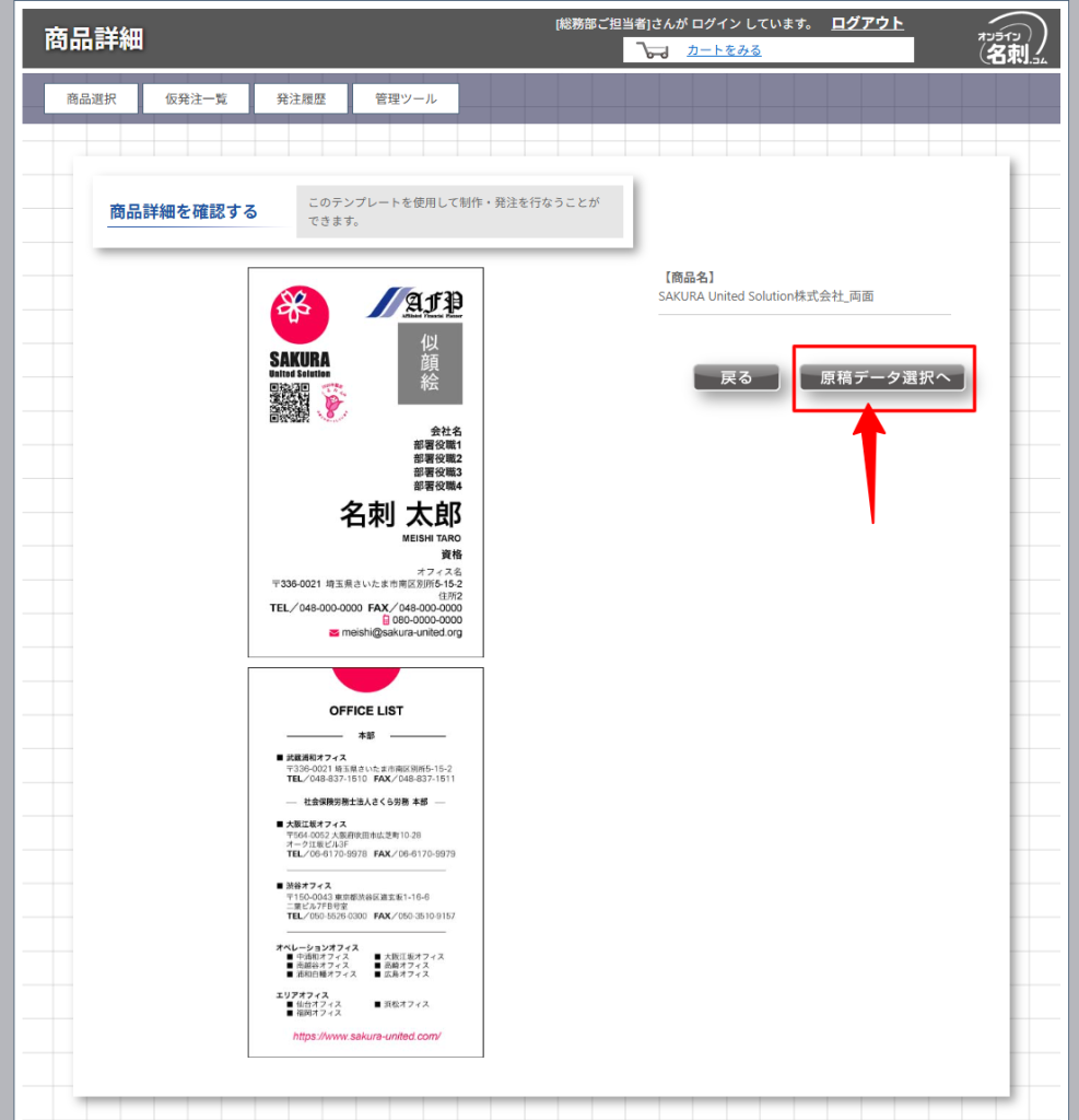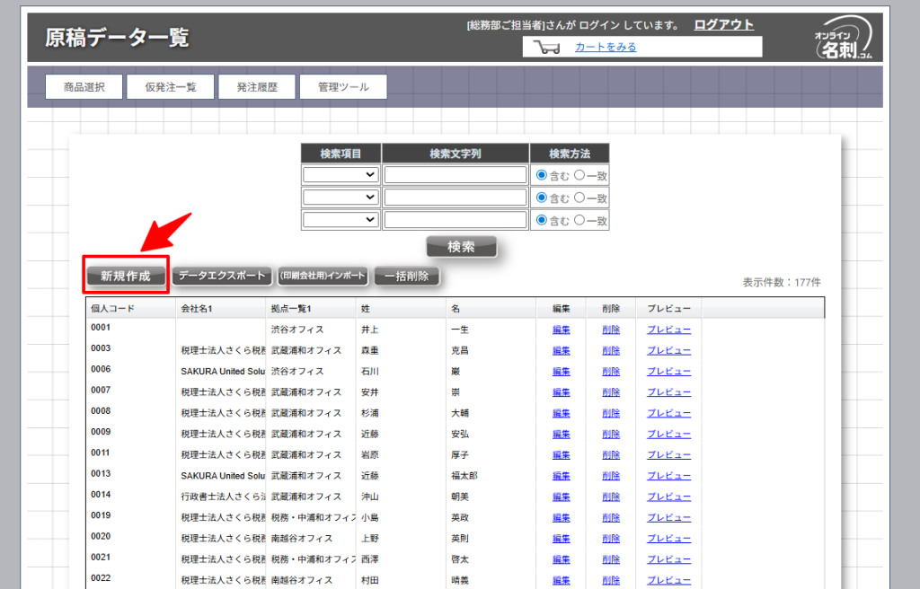 ⑨「仮発注一覧」画面を開き、発注対象の名刺を選択し、「発注」を行い、完了。