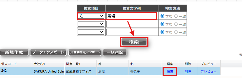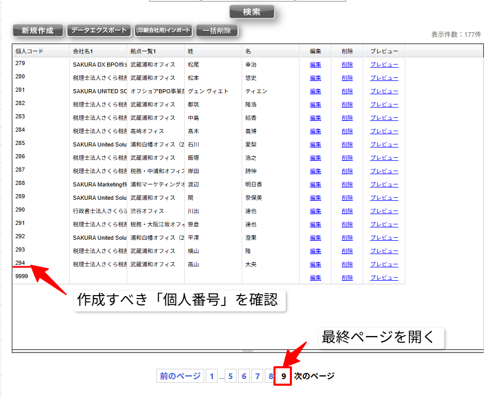 ②「原稿データ一覧」ページを開く。検索機能を使い、該当者を表示する。