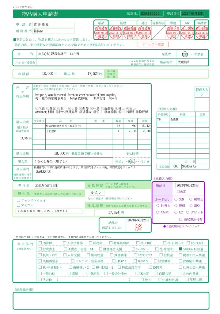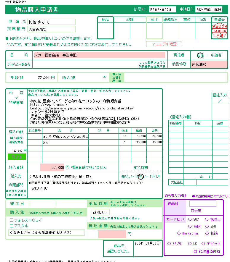 拡大経営会議の時と役員から依頼があった際は、弁当を選んでから、総務X-Point購入申請を提出し、発注する