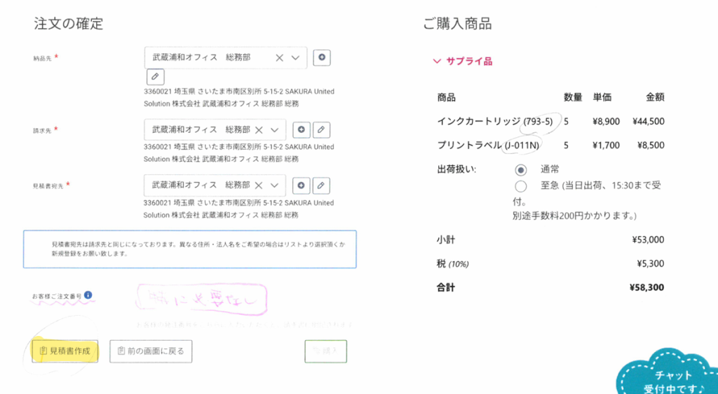 【合計金額が見積書どうりの金額か】【お届け先(オフィス)】【支払方法→請求書】に注意!!