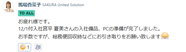 ▢ 配属部署の方へお渡し(チャットで連絡し、総務まで取りに来ていただく) - 武蔵浦和オフィス以外の場合
