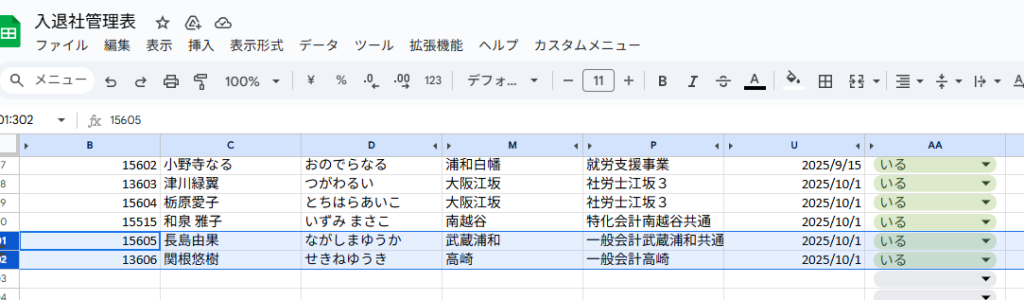新しく入社する方の行をそのままコピーする。