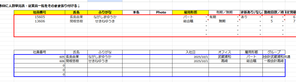 2.の青枠、社員番号(3ケタ)からグループまでの項目を値張り付け、