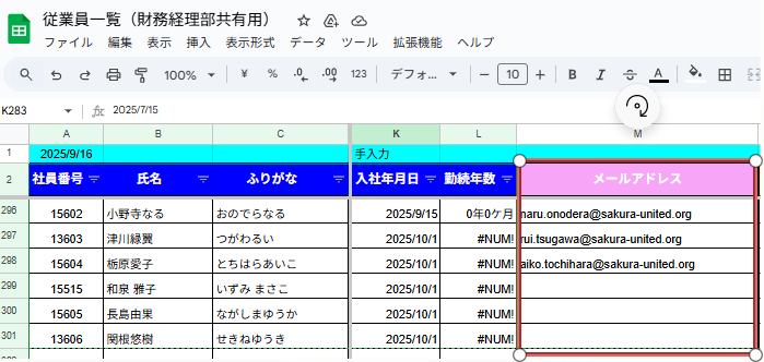 スプシ 従業員一覧(財務経理部共有用)のメールアドレスの項目に転記する。