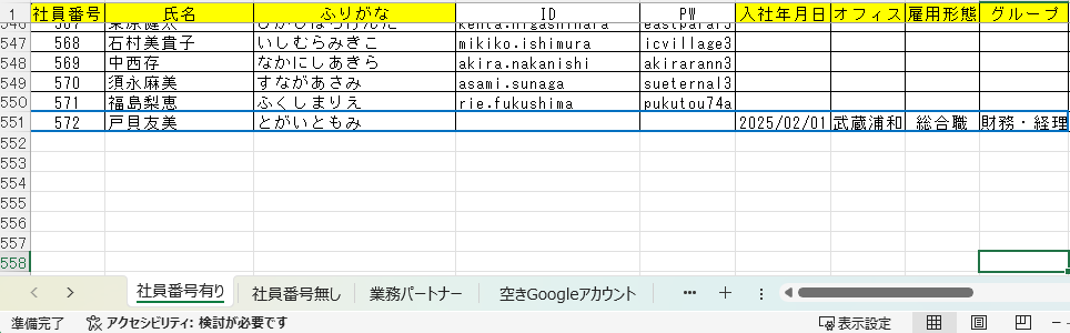 3.Excel「アカウント一覧」の「社員番号有り」のタブを開き、