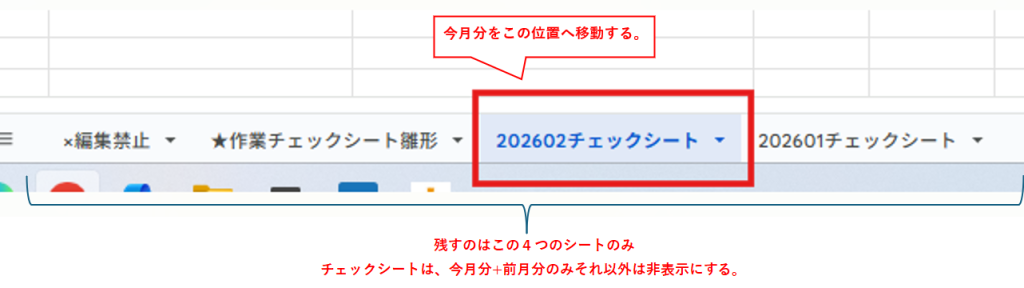 チェックシートは、今月・前月のみ残す。それより以前のシートは非表示にする。