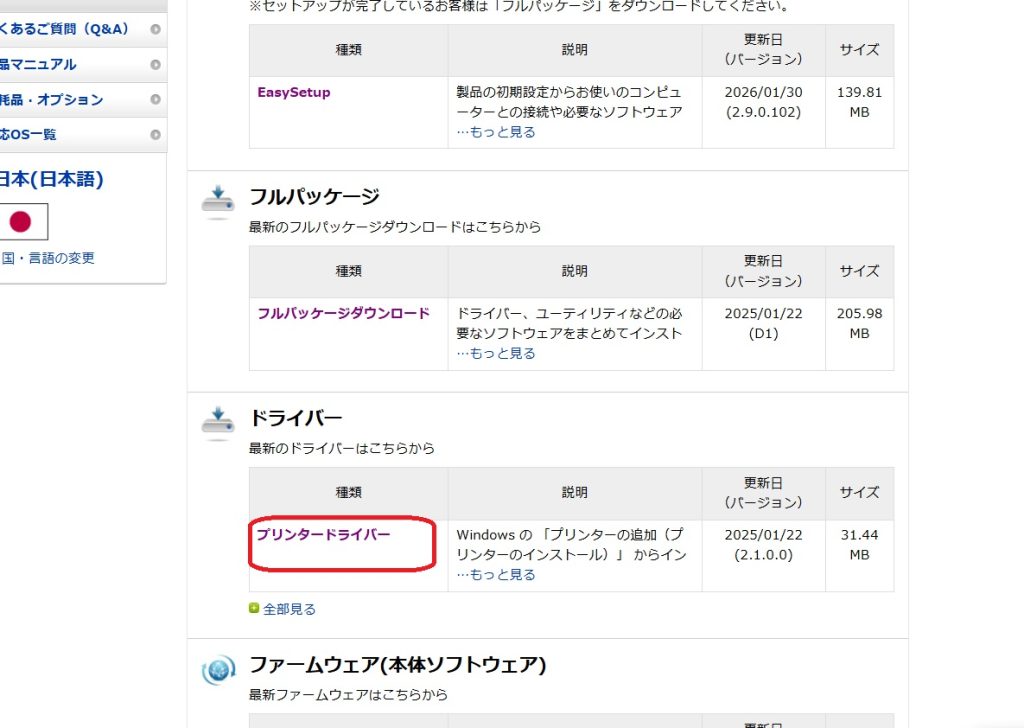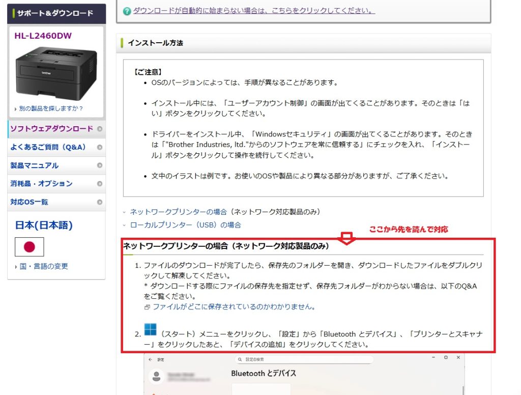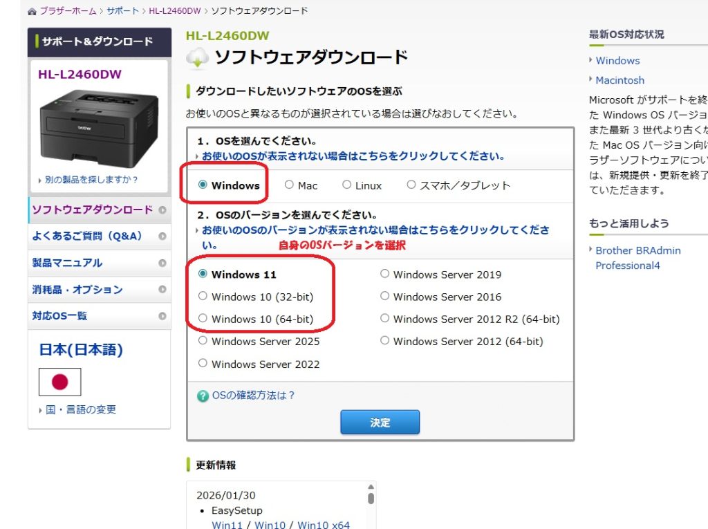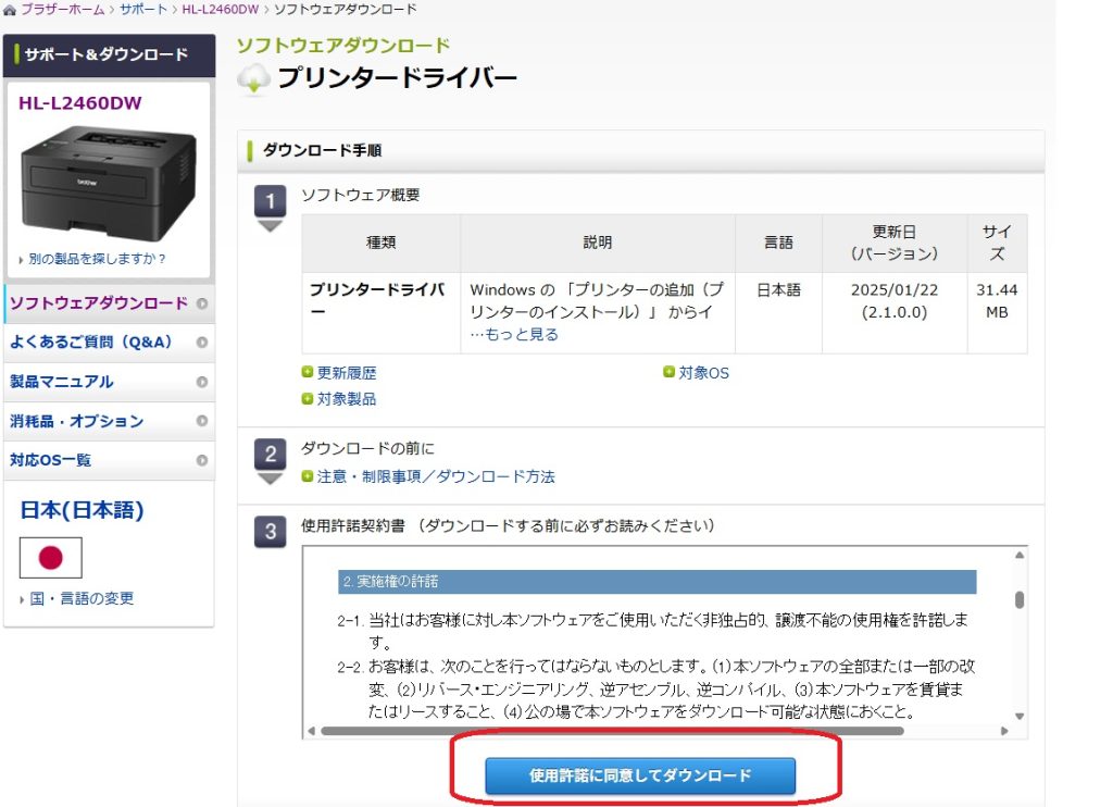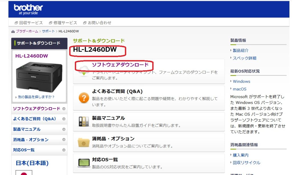 Brother公式サイトから HL-L2460DW 専用ドライバーをダウンロード。